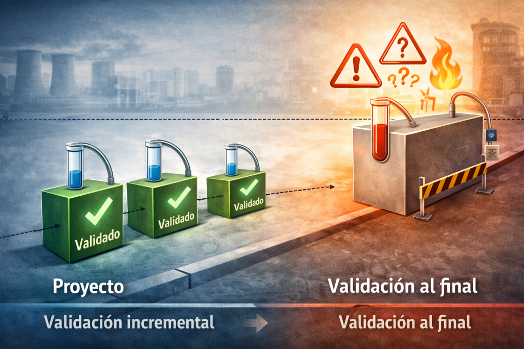 En muchos proyectos industriales, la validación se concibe como una fase final: algo que se aborda cuando el sistema “ya está hecho”, integrado y aparentemente funcional. Durante meses —a veces años— se diseña, se implementa y se prueba de forma parcial, con la idea implícita de que la validación completa llegará al final.